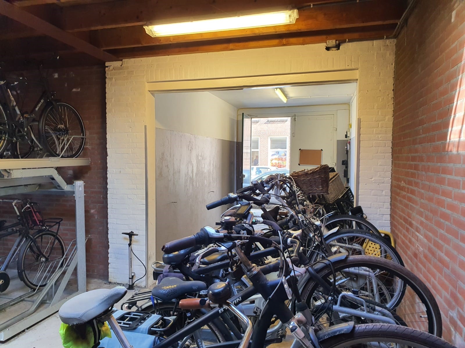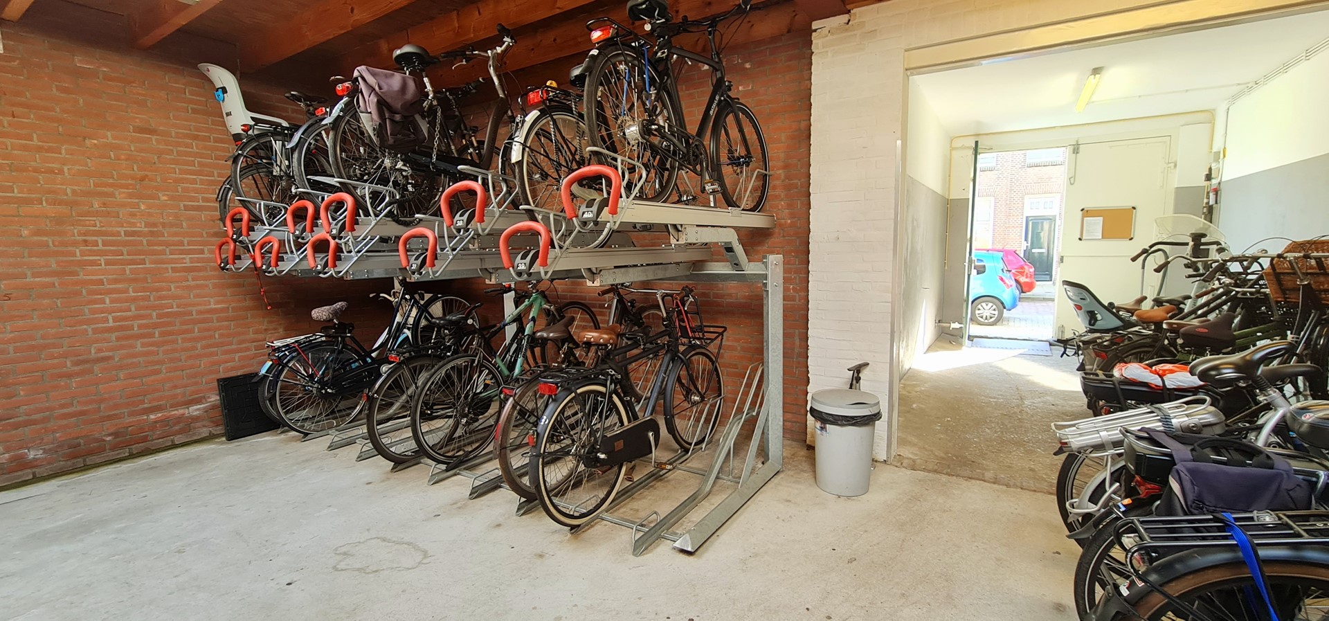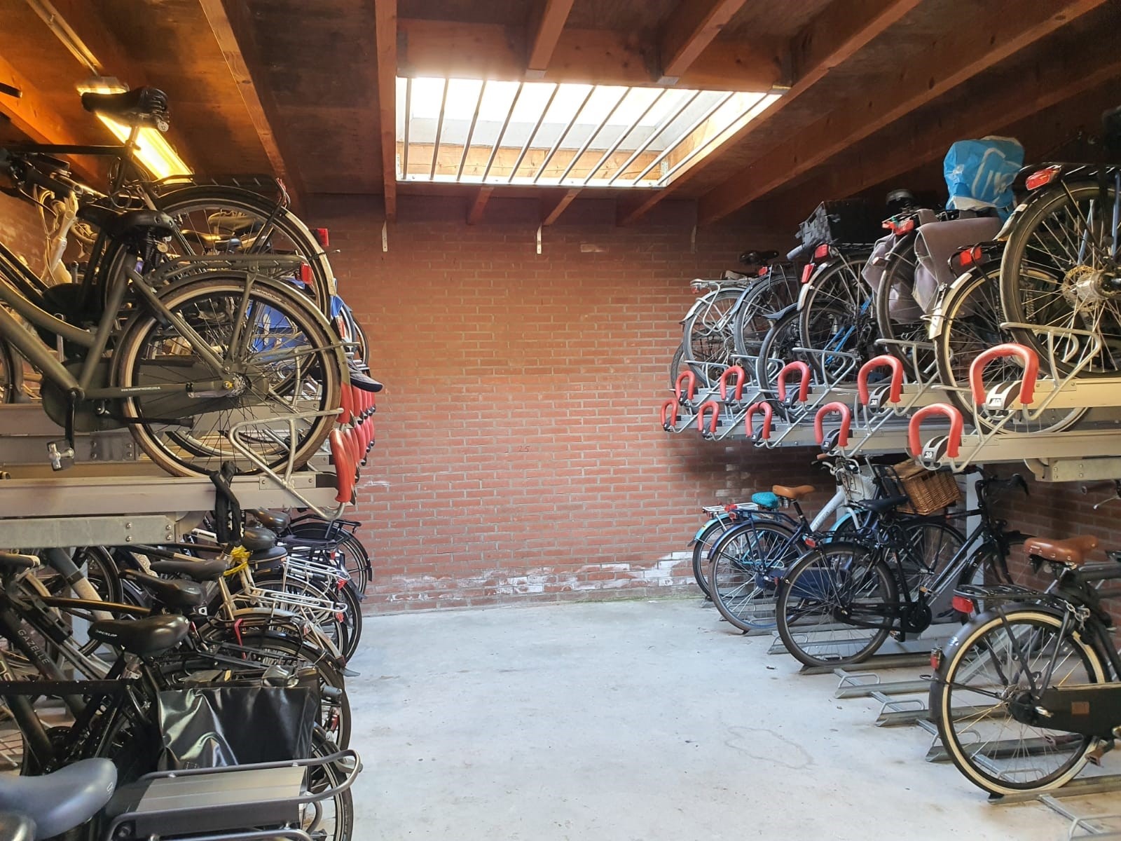 Met 2 tweelaagse fietsenrekken Velovators (tilliften) en diverse losse stallingsplaatsen biedt deze bedrijfsruimte plek voor tenminste 60 fietsen.