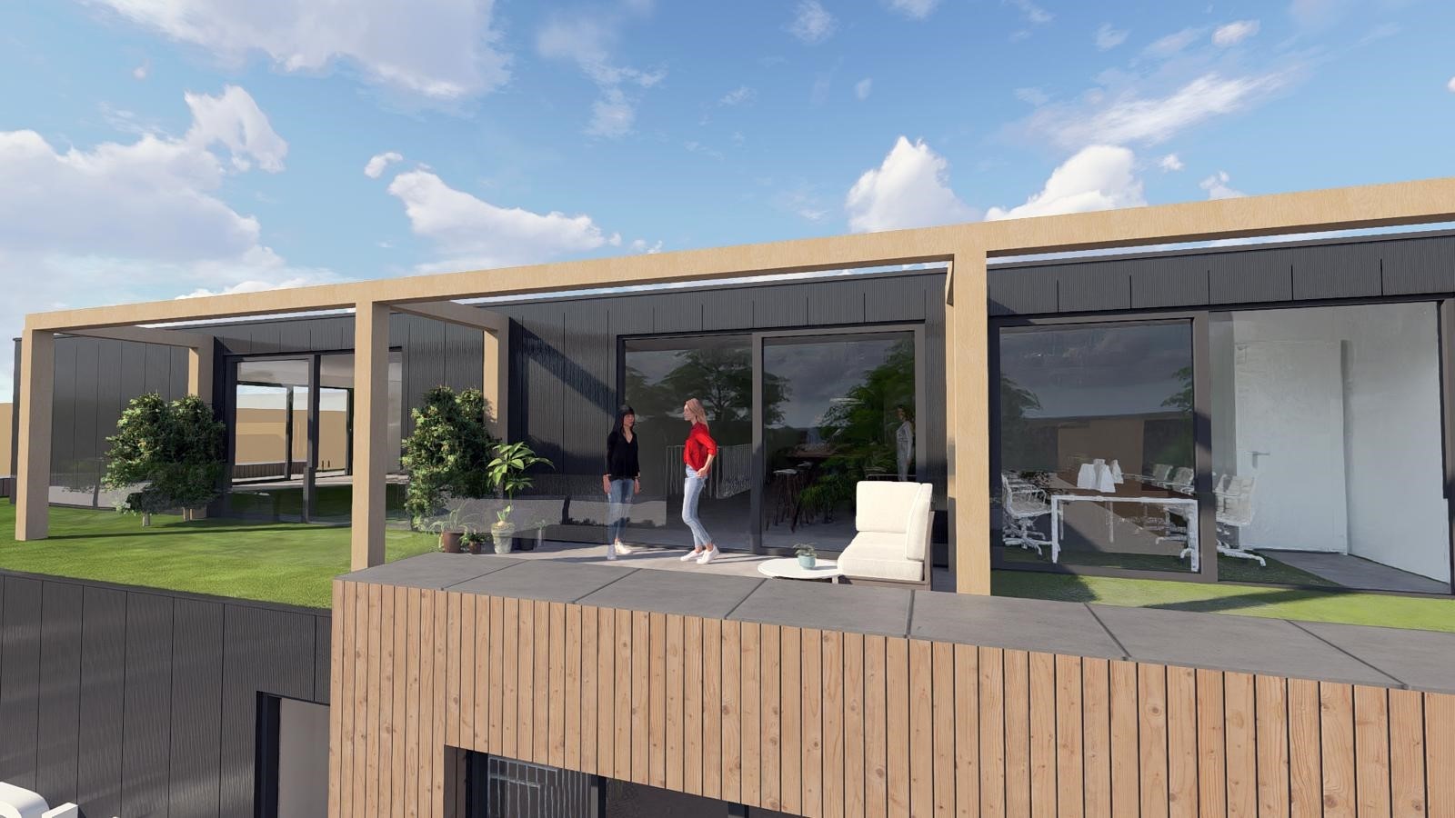 De architectuur van Bedrijfspark Ketelweg kenmerkt zich door strakke lijnen en hoogwaardige materialen. De combinatie van donkere gevelbekleding met verticale houten accenten zorgt voor een luxe, tijdloze uitstraling. Grote raampartijen bieden veel daglicht en versterken de representatieve uitstraling van iedere bedrijfsunit.