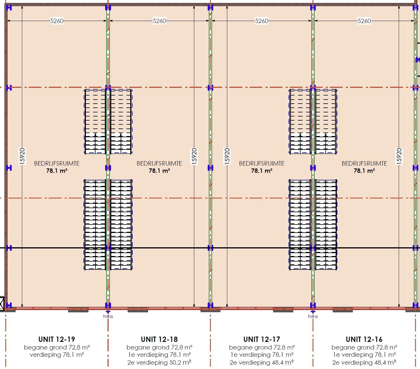 NB: Oppervlaktes zijn indicatief (ca. BVO), inclusief verdiepingen en eventuele dakterrassen. Units kunnen worden gekoppeld.